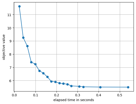 Run the solver and plot the times and objective function values of all solutions obtained.