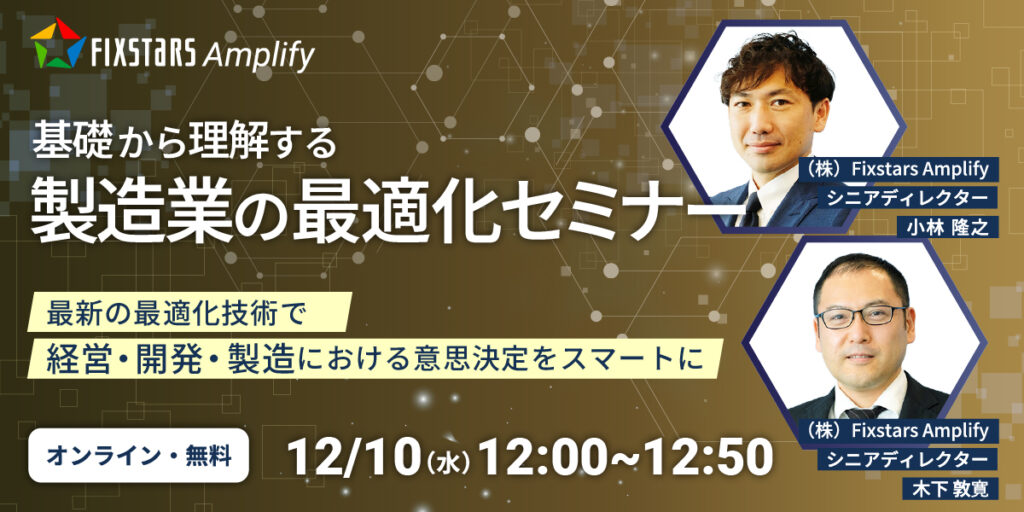 本セミナーでは、製造業における経営、研究・開発、生産、物流等のあらゆる現場に存在する最適化問題や、弊社の提供する最適化エンジン「Fixstars Amplify」を活用した具体的な解決策や実践事例を詳しくご紹介します。